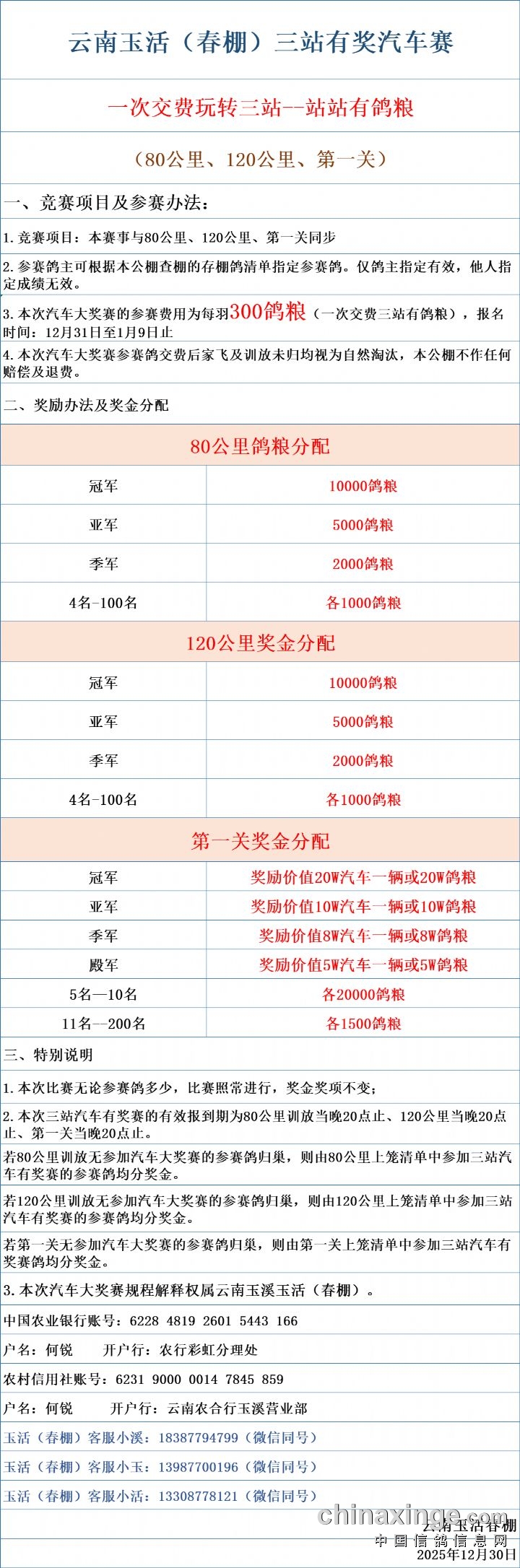 云南玉活(春棚):20公里查棚站追加赛鸽粮领取及无鸽退预定金公告