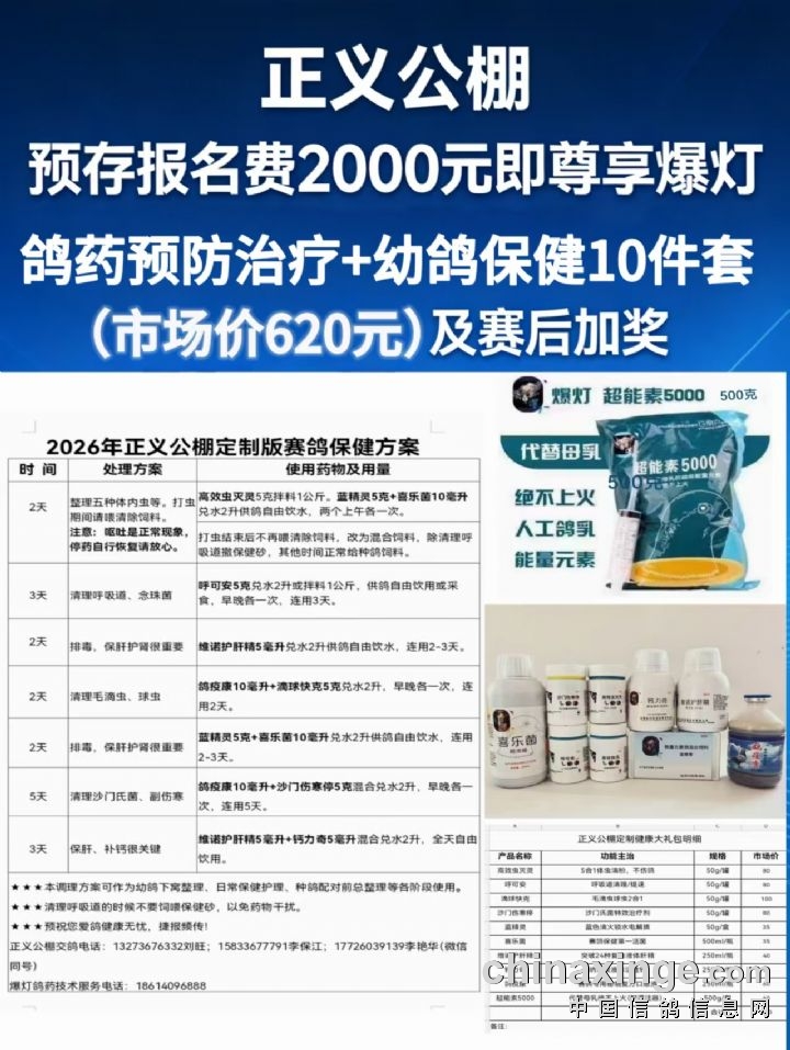 正义公棚预存2000元即尊享爆灯种鸽整理10件套装一份(市场价620元)及赛后加奖,