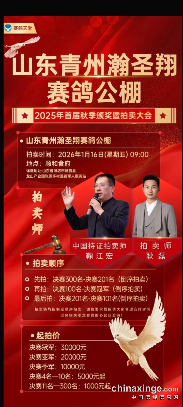 山东青州瀚圣翔赛鸽公棚拍卖会公告
