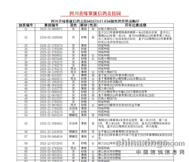 四川善缘聚拢信鸽竞技园3月31日活动抽奖鸽资料及顺序