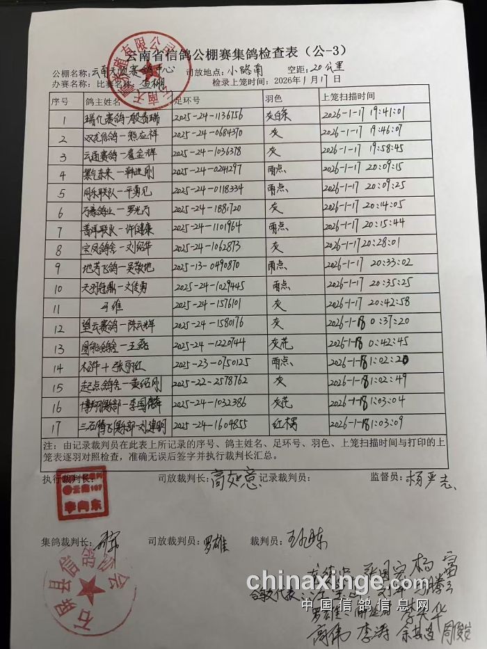 云南红河天顺赛鸽中心上笼清单按上笼顺序