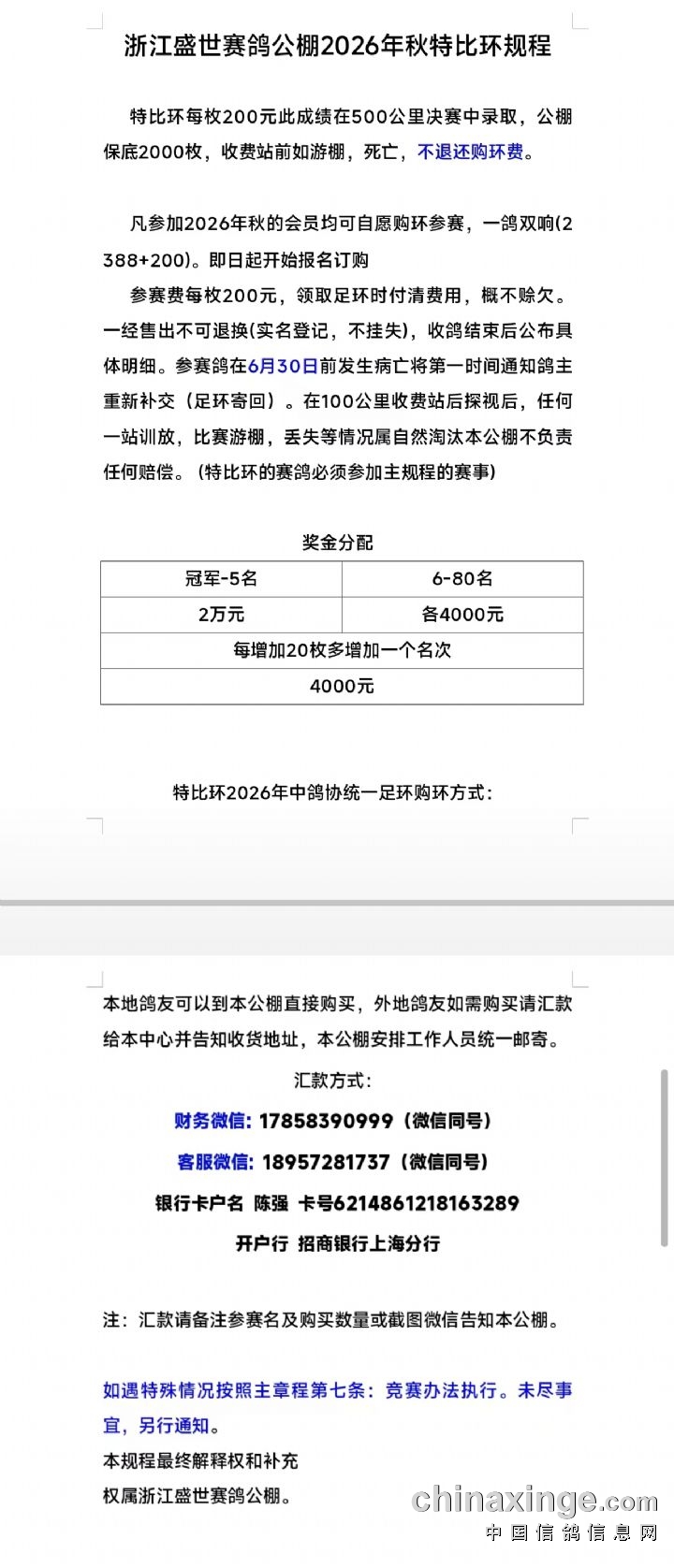 浙江盛世赛鸽公棚2026年秋特比环规程