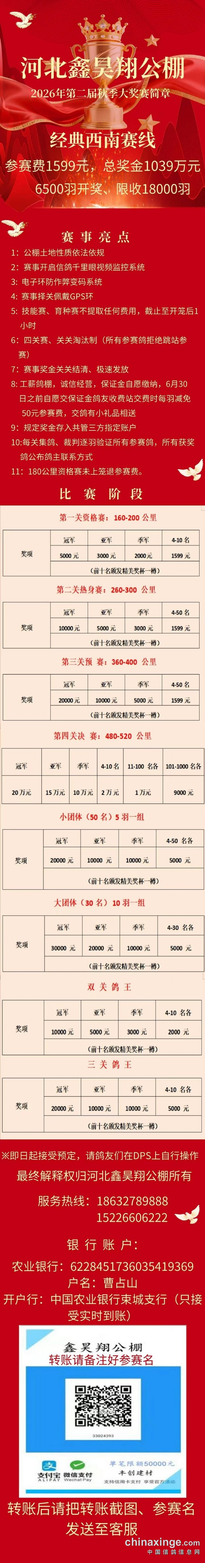 择关佩戴GPS定位环,千里眼保驾护航,技能赛截止到开笼后一小时,自愿缴纳一羽保证金,收费时每羽减免50元参赛费。