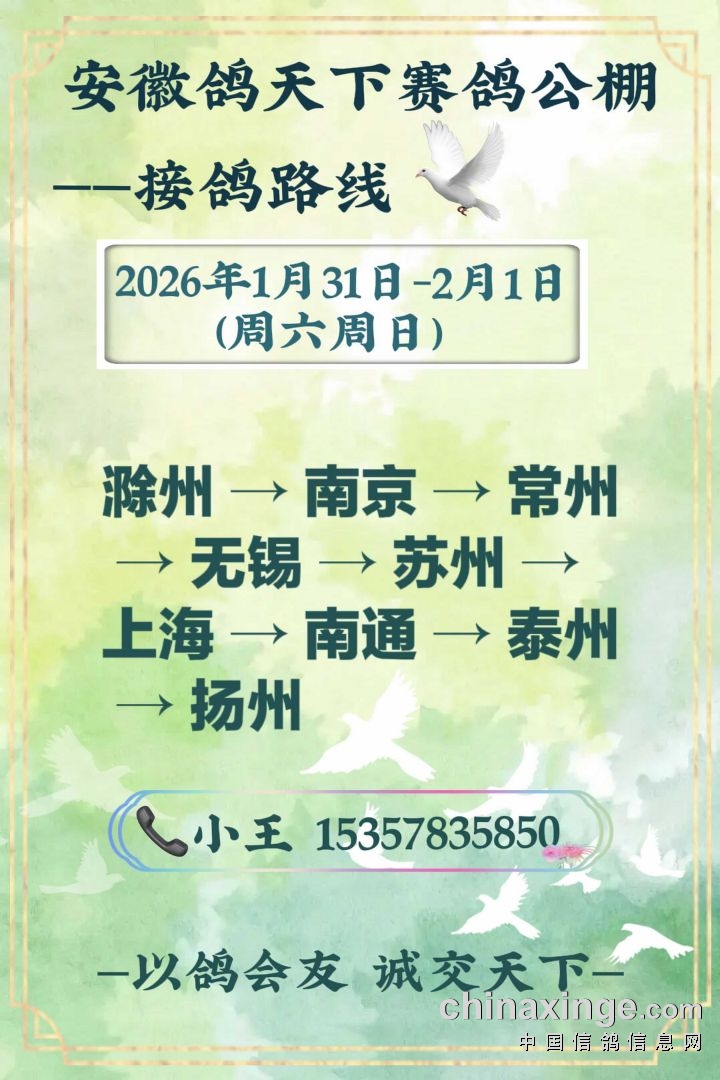 安徽鸽天下1月31-2月1日江苏、上海接鸽路线图