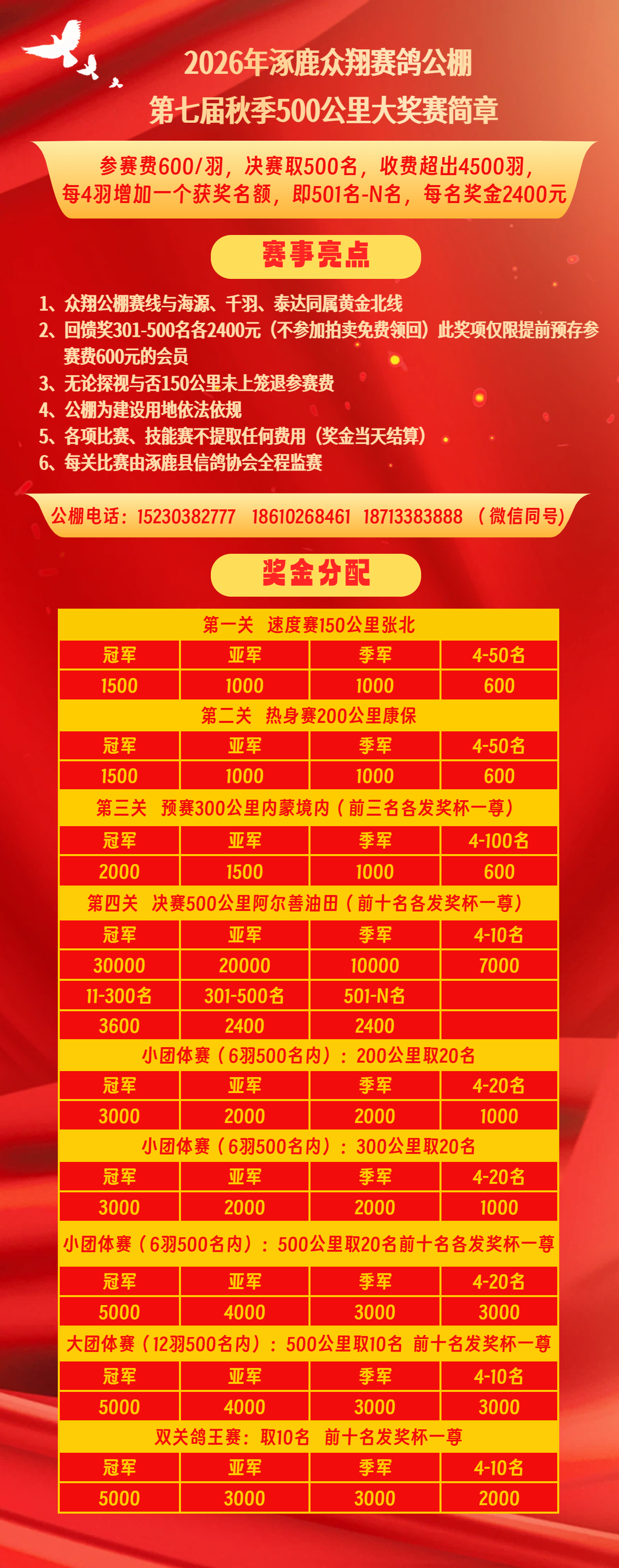2026年涿鹿众翔赛鸽公棚第七届秋季500公里大奖赛规程