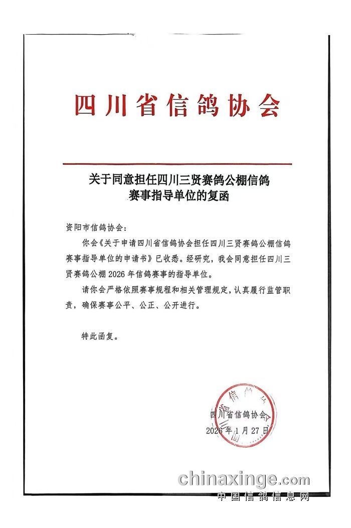 四川省鸽协同意担任三贤公棚赛事指导单位的复函