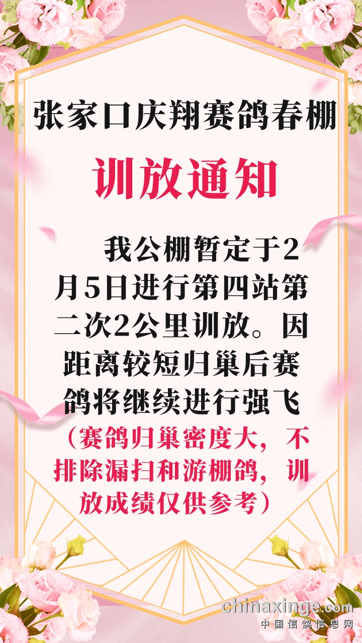 张家口庆翔公棚(春棚)第四站第二次2公里训放通知