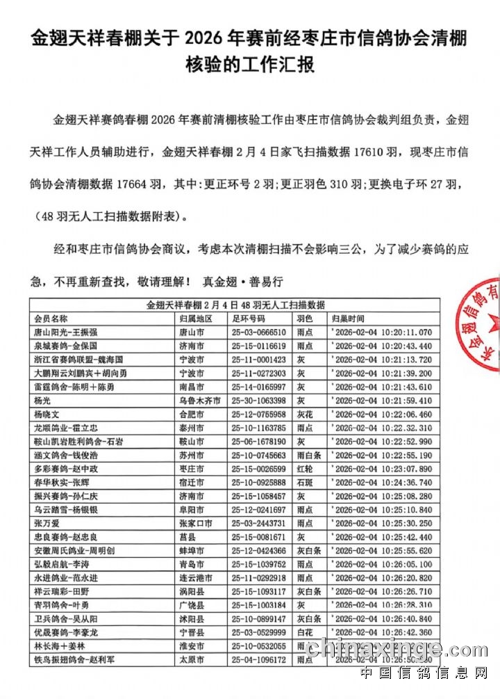 金翅天祥春棚关于2026年赛前经枣庄市信鸽协会清棚核验的工作汇报