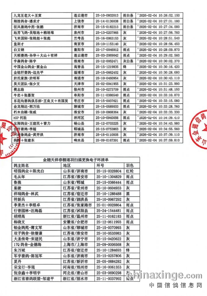 山东金翅天祥春棚 98-120公里收费站集鸽扫描更换电子环清单