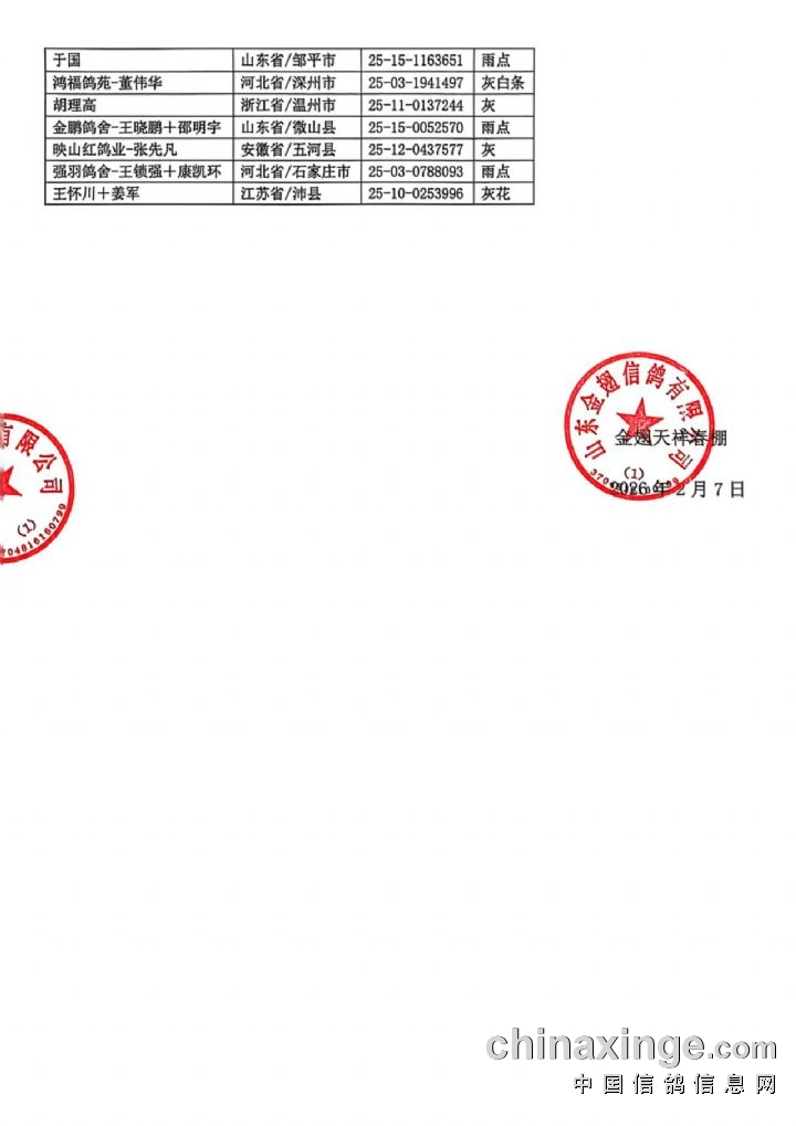 山东金翅天祥春棚 98-120公里收费站集鸽扫描丧失飞行能力清单