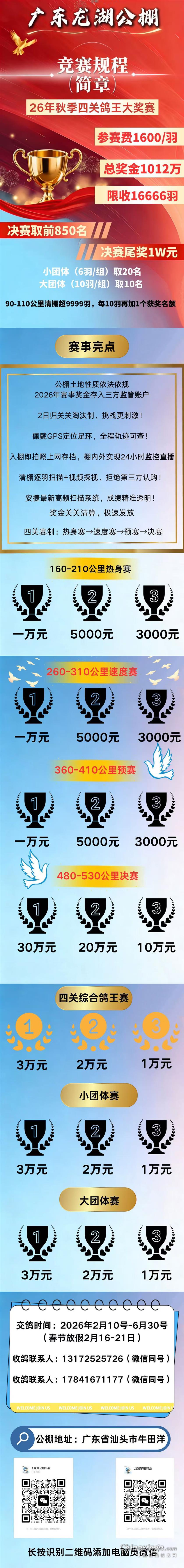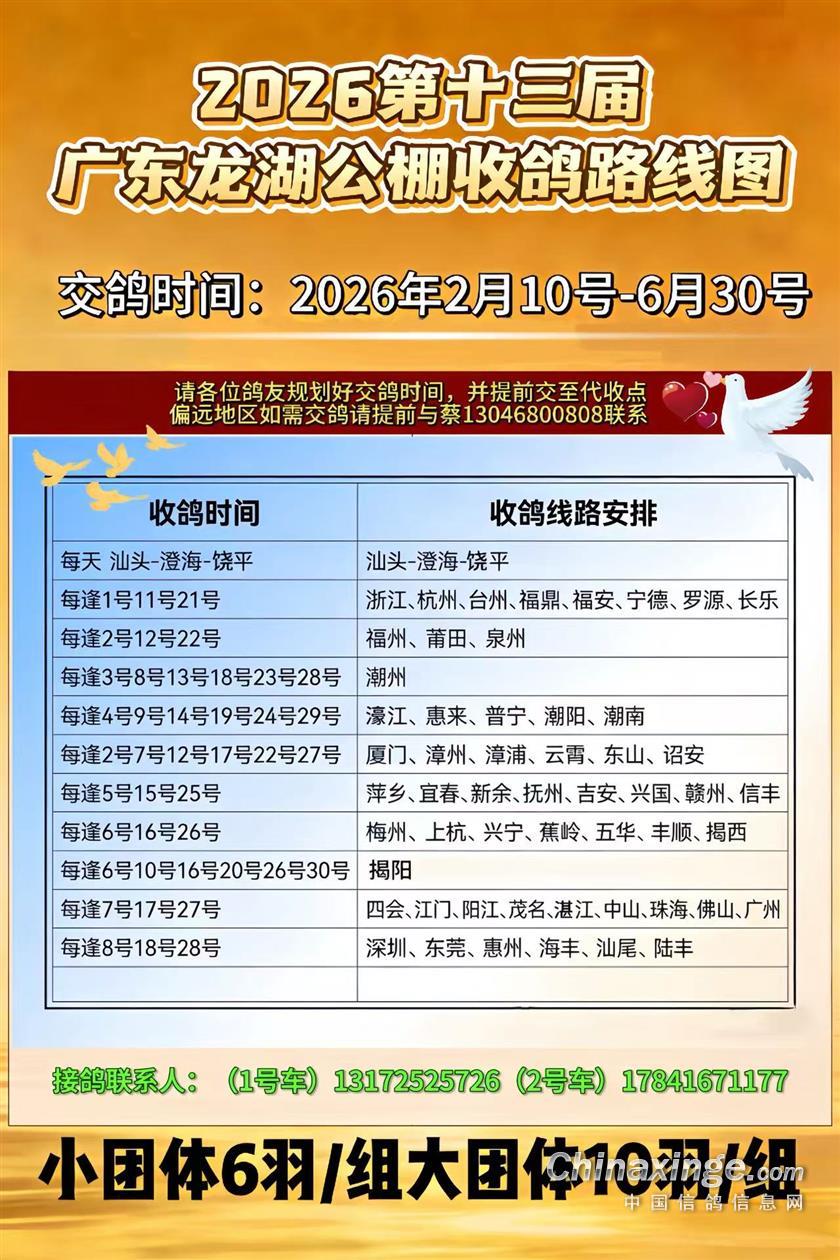 广东龙湖赛鸽公棚2026第十三届入棚清单