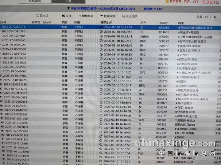 宁夏乐祥公棚近期归巢鸽明细