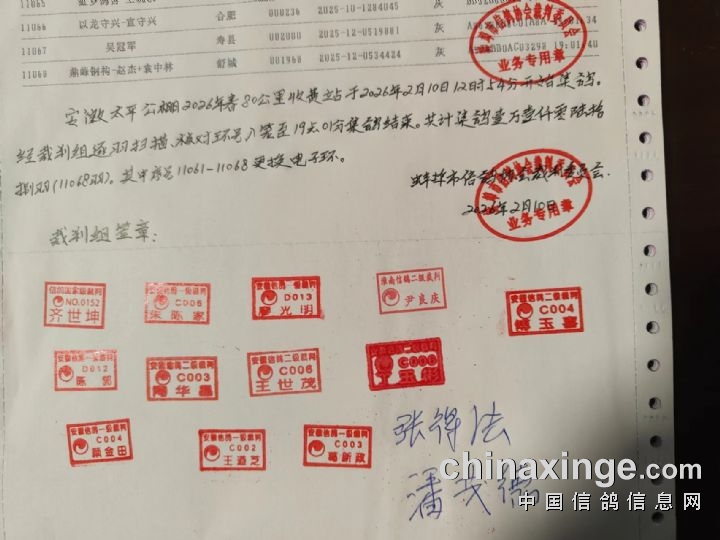 安徽太平公棚2026年80公里收费站集鸽共计11068羽,其中11061-11068八羽赛鸽更改电子环。