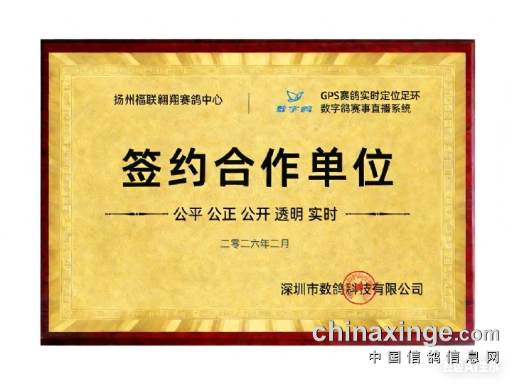 扬州福联翱翔始终坚守“公平、公正、公开”的办赛宗旨,致力于为广大鸽友打造纯净、透明的竞赛环境。为从技术层面防范赛事作弊行为,保障赛事的权威性与公信力,本中心在新年来临之际,与深圳市数鸽科技有限公司进行签约,将在26年秋季为所有决赛参赛鸽统一佩戴“数字鸽”GPS 实时定位足环。这一举措再次彰显了福联翱翔公棚诚信办赛的决心,2026欢迎大家来福联参赛,共逐赛鸽荣耀、共创赛场辉煌!