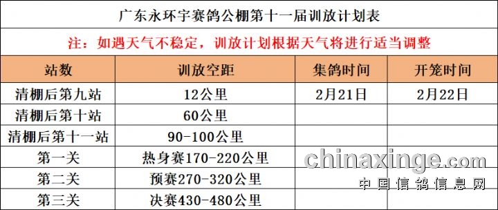 广东永环宇赛鸽公棚12公里定于2月21日集鸽,2月22日训放,连扫2天,训放数据网上直播、快手直播号:YHY13229999977(不排除漏扫及电子环损坏,路训没有短信通知,望各位鸽友们悉知)。