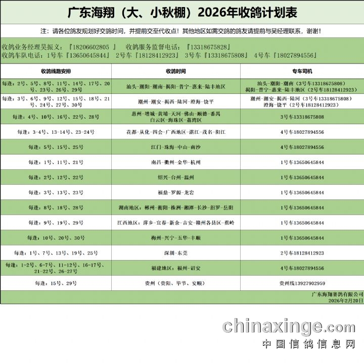 广东海翔(大、小秋棚)2026年收鸽计划表