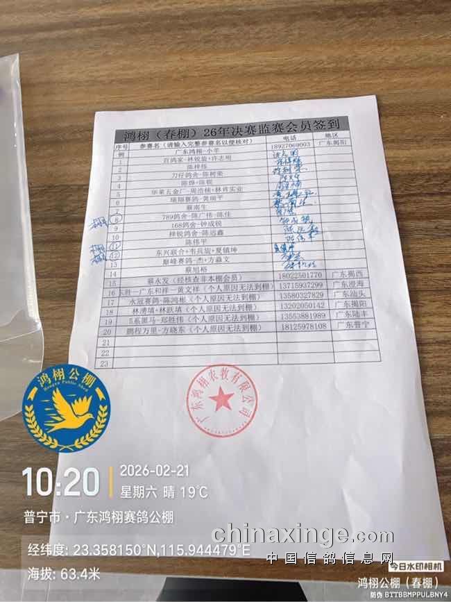 广东鸿栩(春棚)2026年首届春赛附加赛单羽常规赛有效名单(开笼起至当天19:00分为有效报道期)