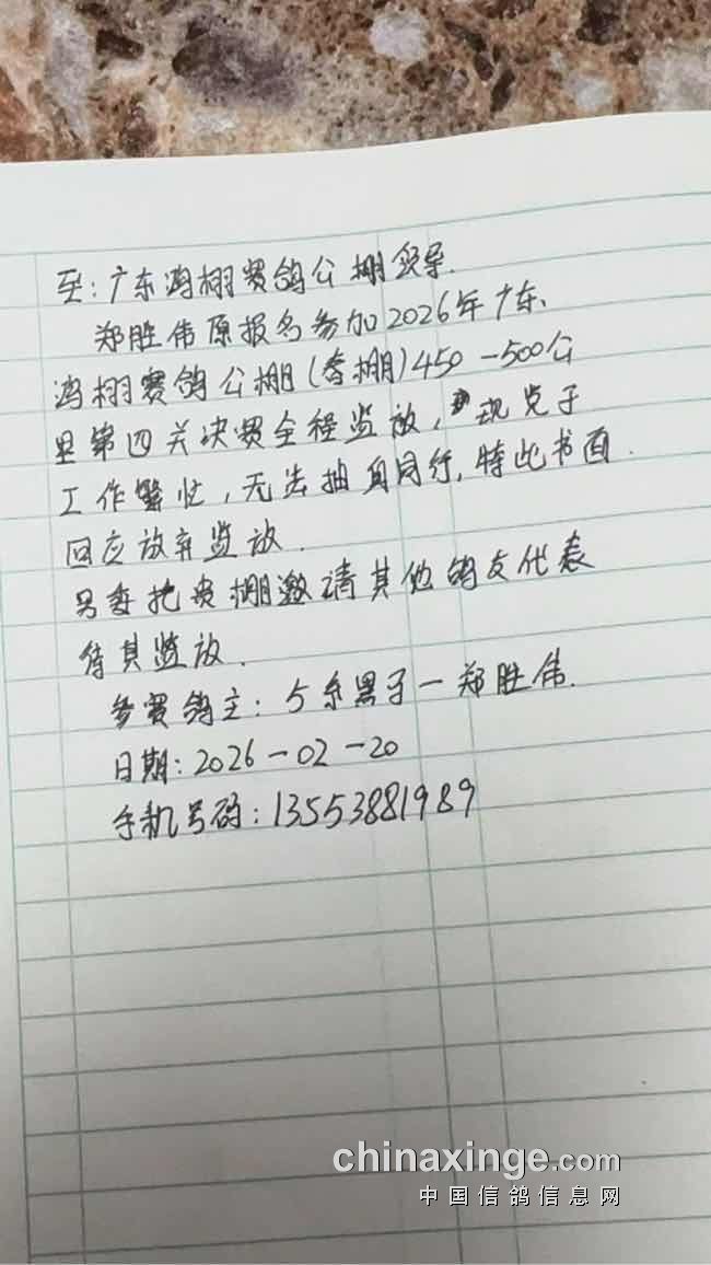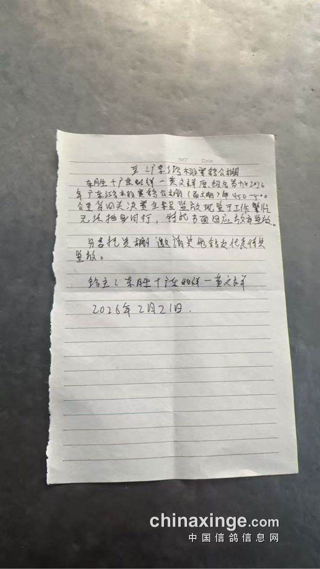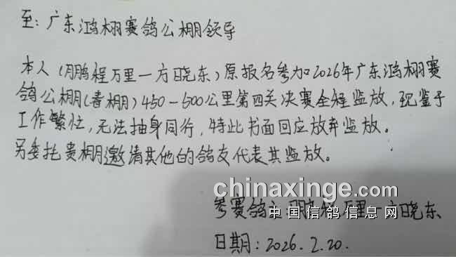 广东鸿栩(春棚)2026年首届春季四关赛500-580公里附加赛未上笼退常规赛清单