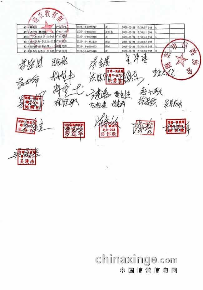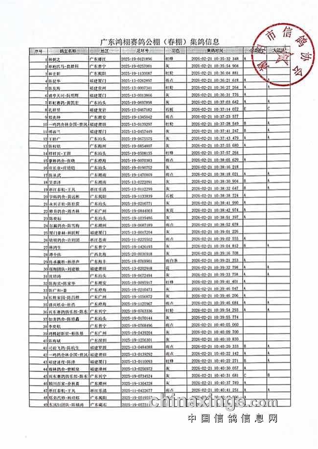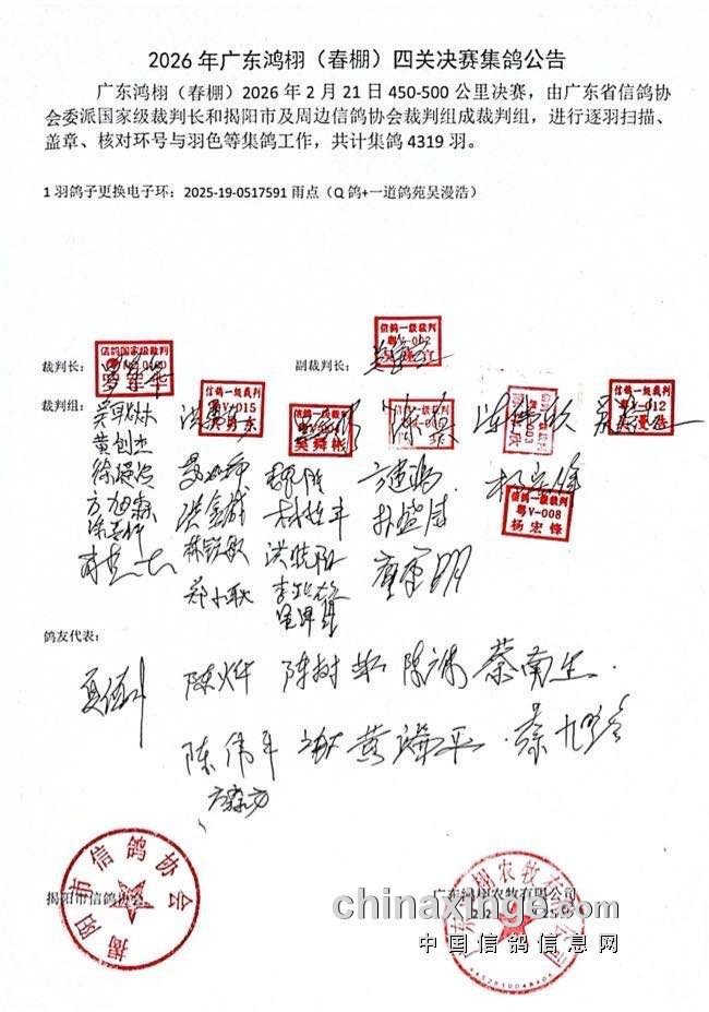 广东鸿栩(春棚)2026年首届春季四关赛450-500公里第四关决赛集鸽清单:4319羽