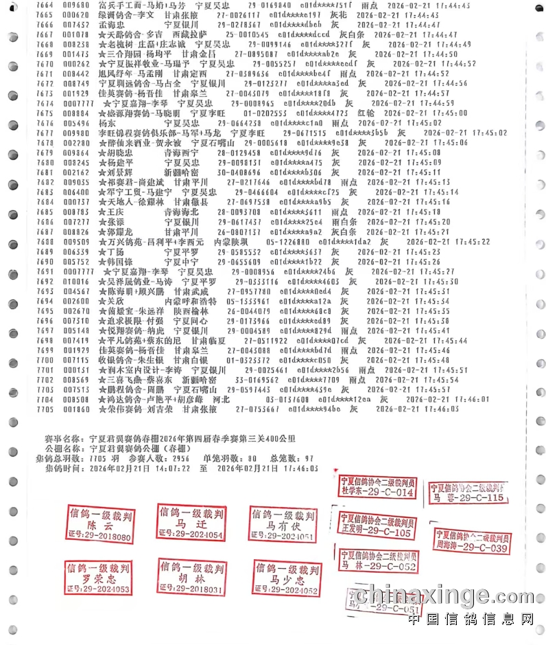 宁夏君翼赛鸽公棚(春棚)850公里集鸽明细--按时间