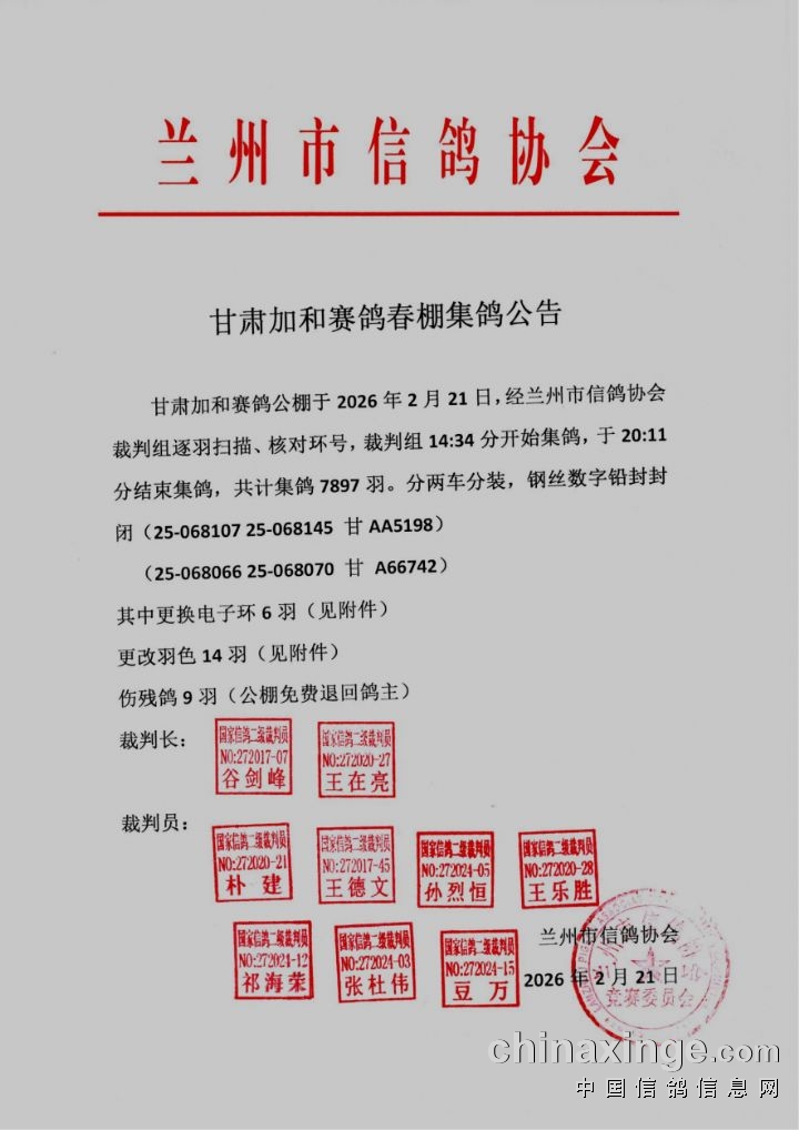 甘肃加和赛鸽公棚于2026年2月21日,经兰州市信鸽协会裁判组逐羽扫描、核对环号,裁判组14:34分开始集鸽,于20:11分结束集鸽,共计集鸽7897羽。分两车分装,钢丝数字铅封封闭(25-068107 25-068145 甘AA5198)(25-068066 25-068070 甘 A66742)