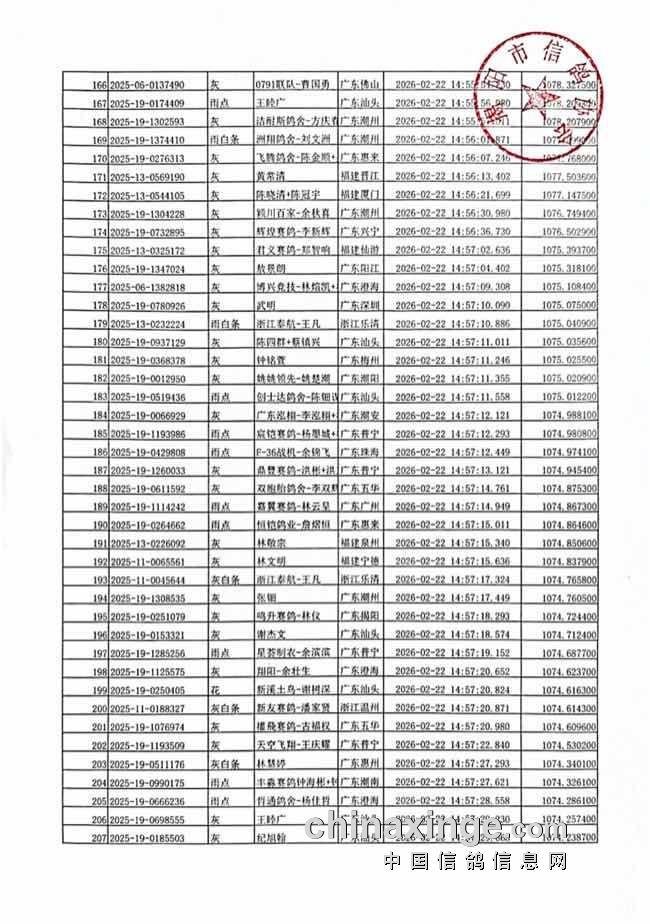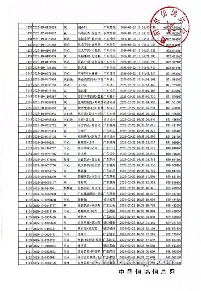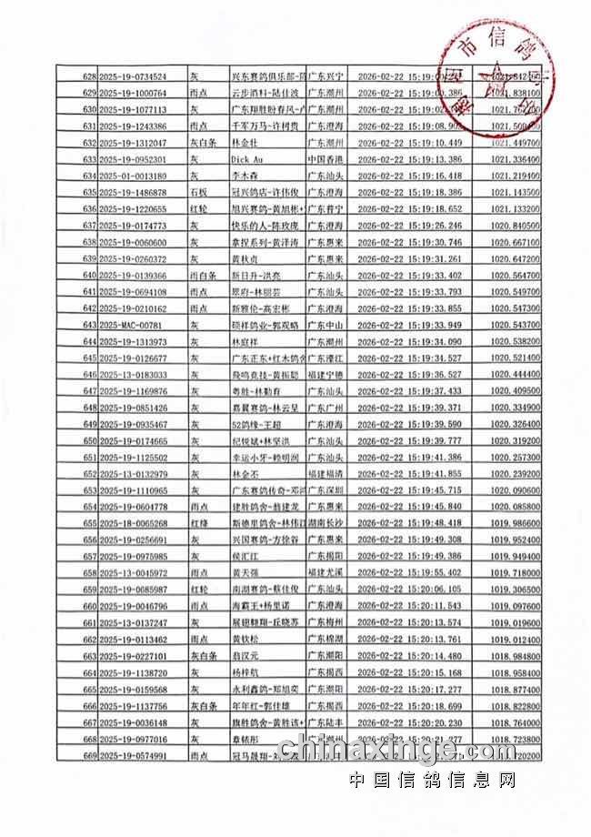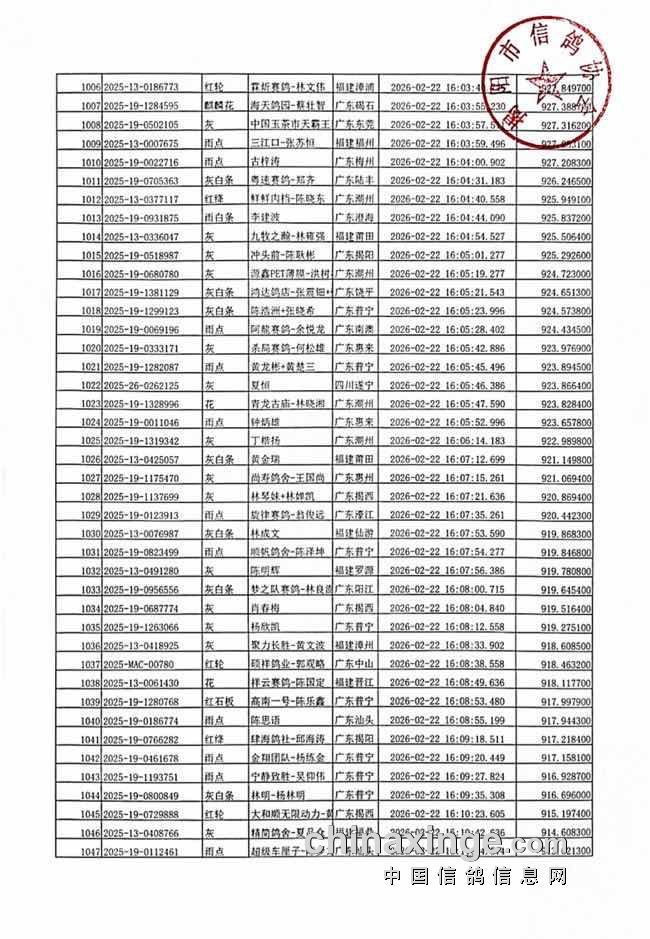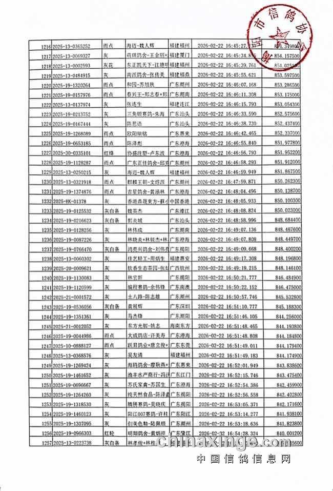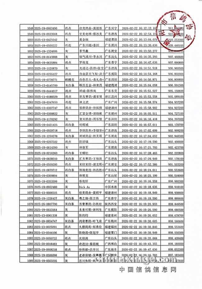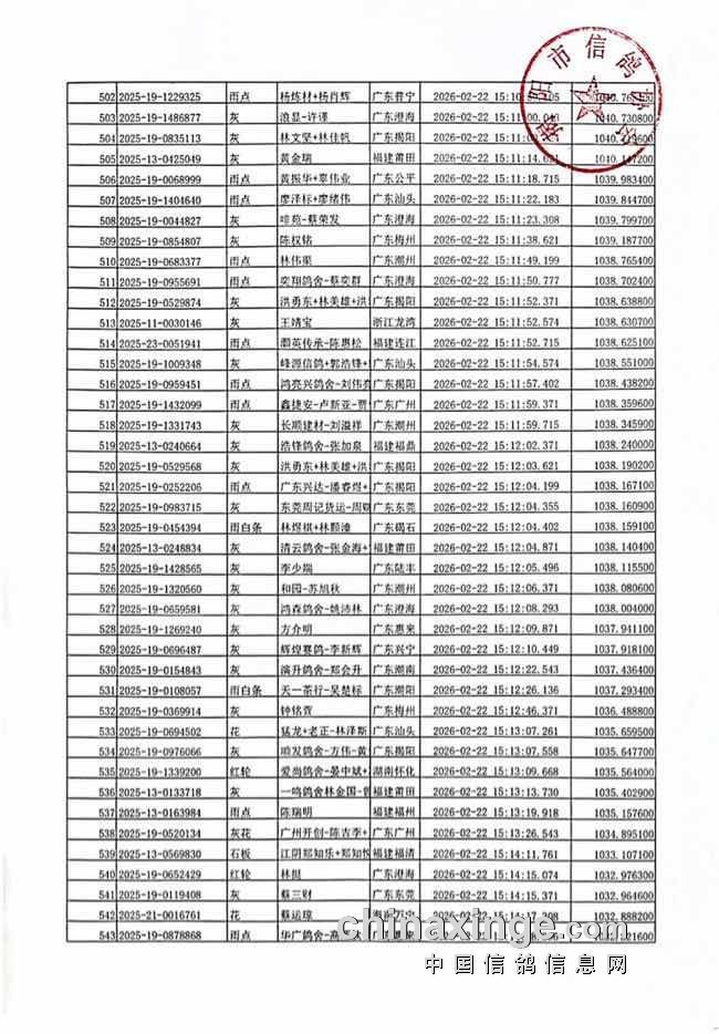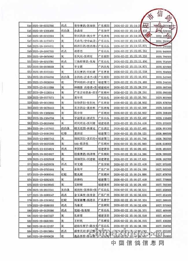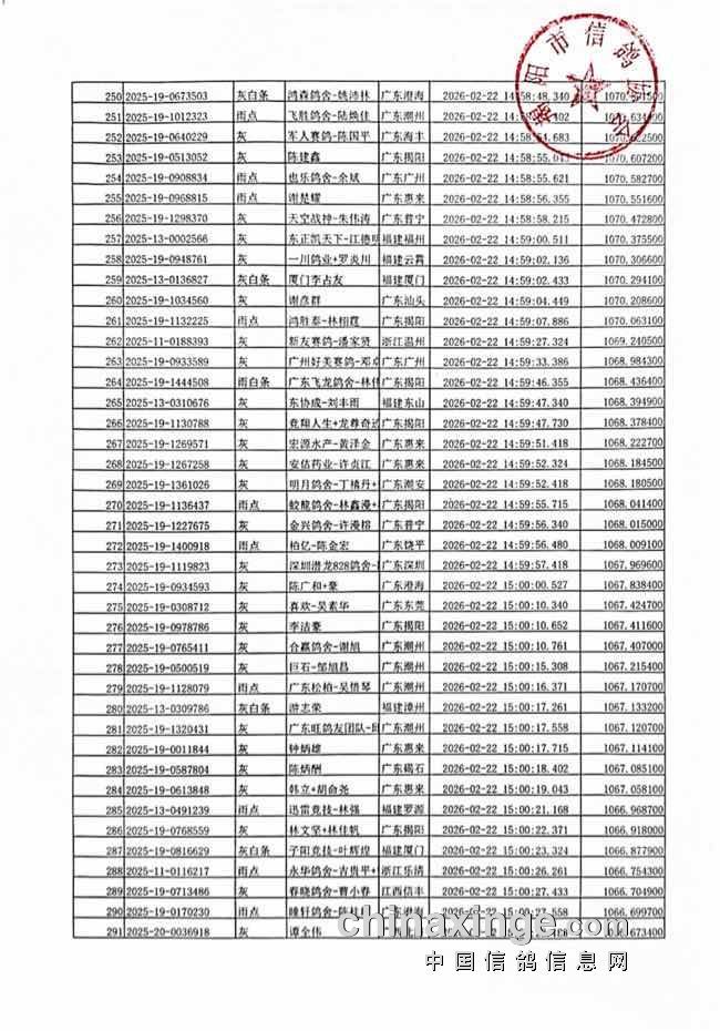 广东鸿栩(春棚)2026年首届春赛附加赛单羽常规赛有效名单(开笼起至当天19:00分为有效报道期)