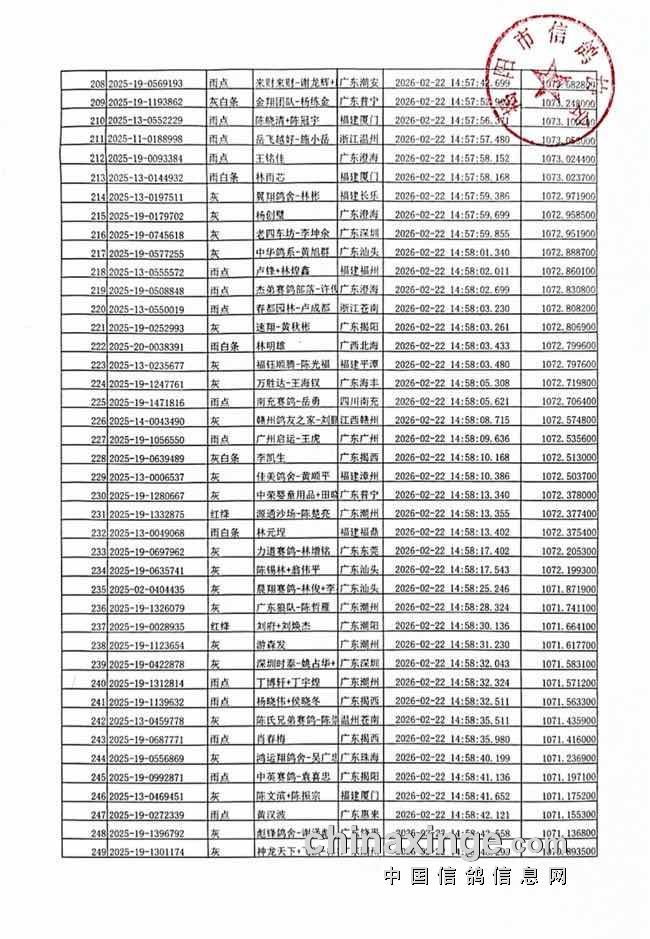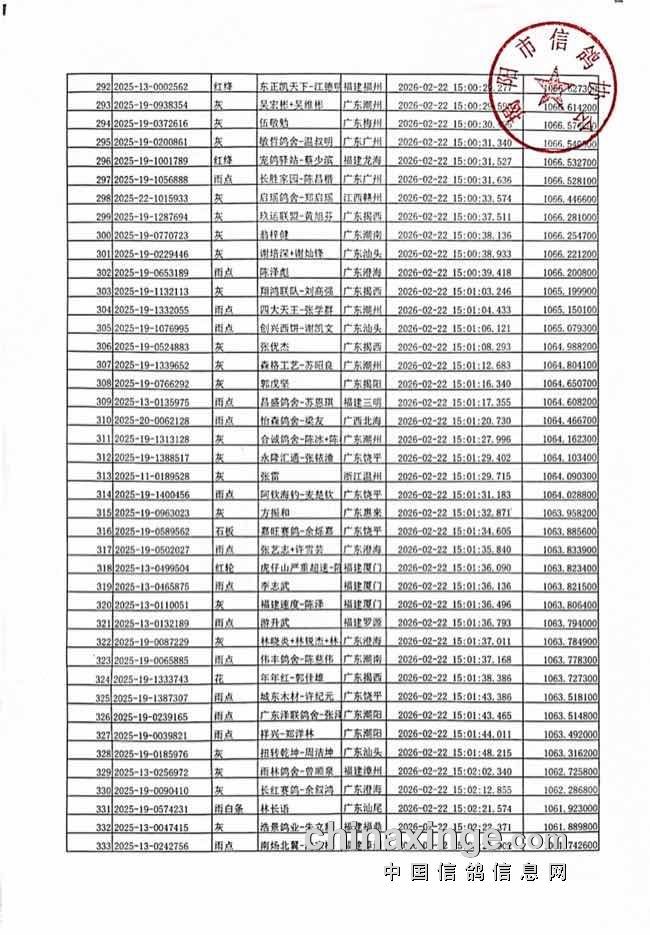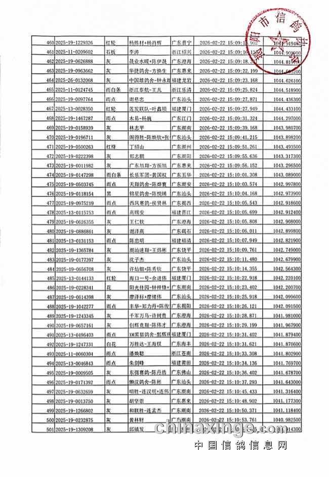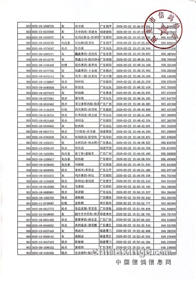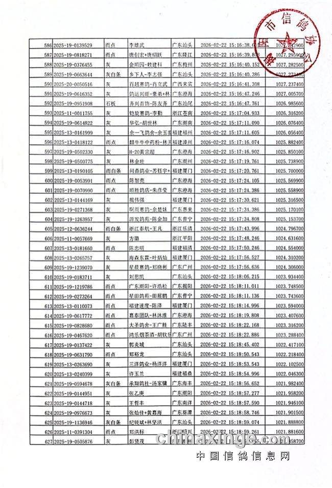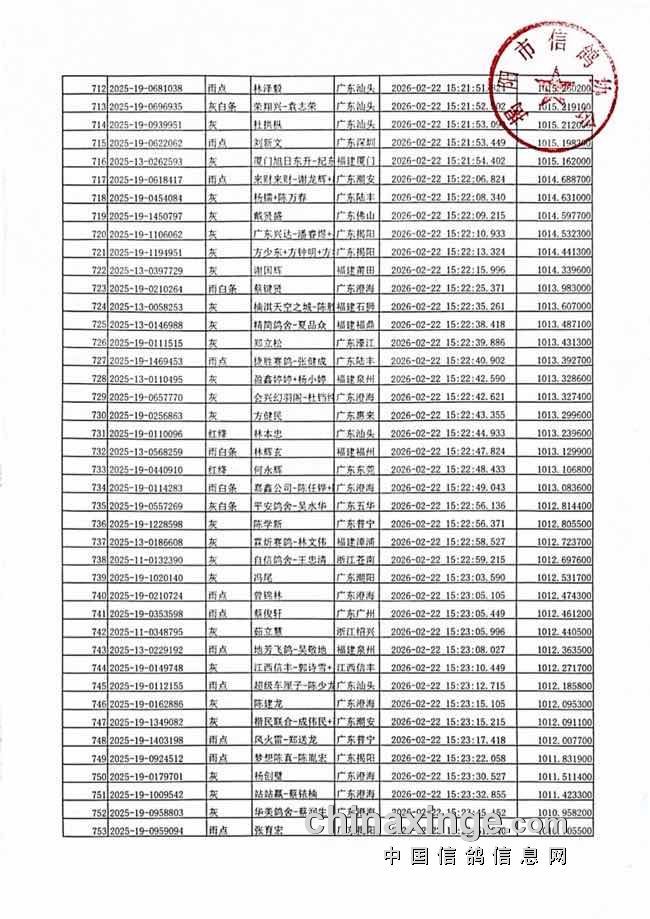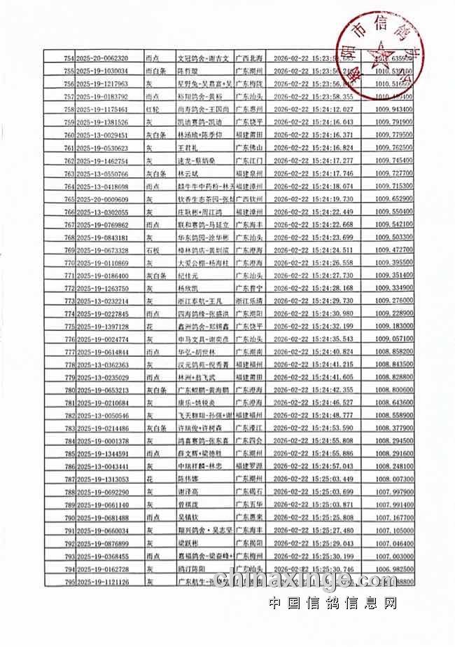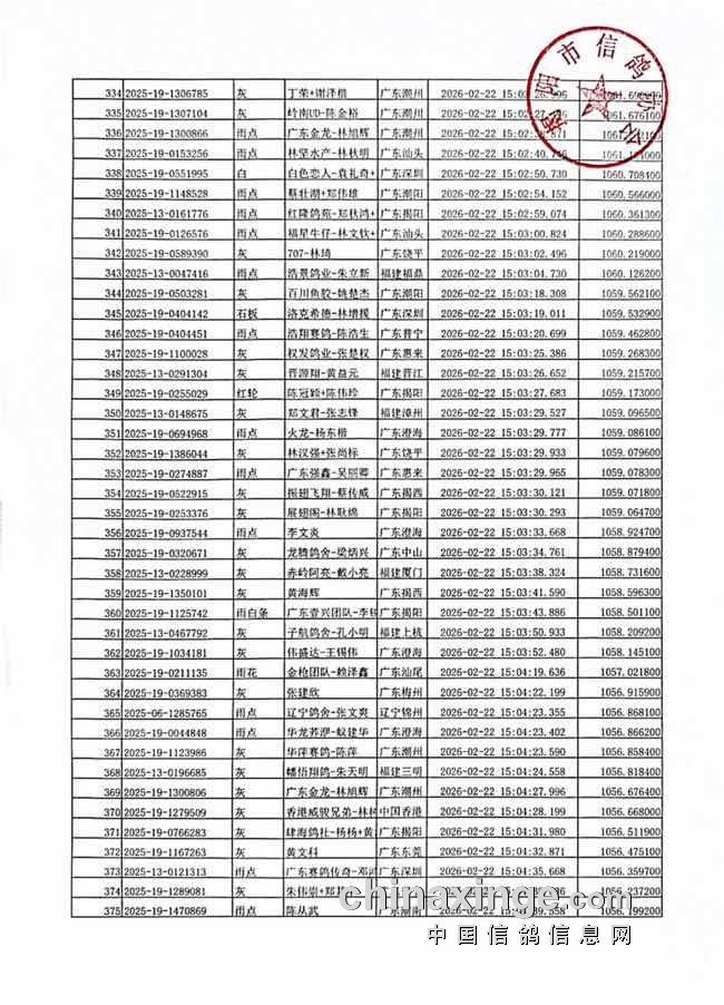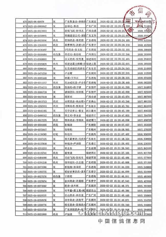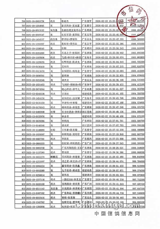 广东鸿栩(春棚)2026年首届春赛附加赛单羽常规赛有效名单(开笼起至当天19:00分为有效报道期)