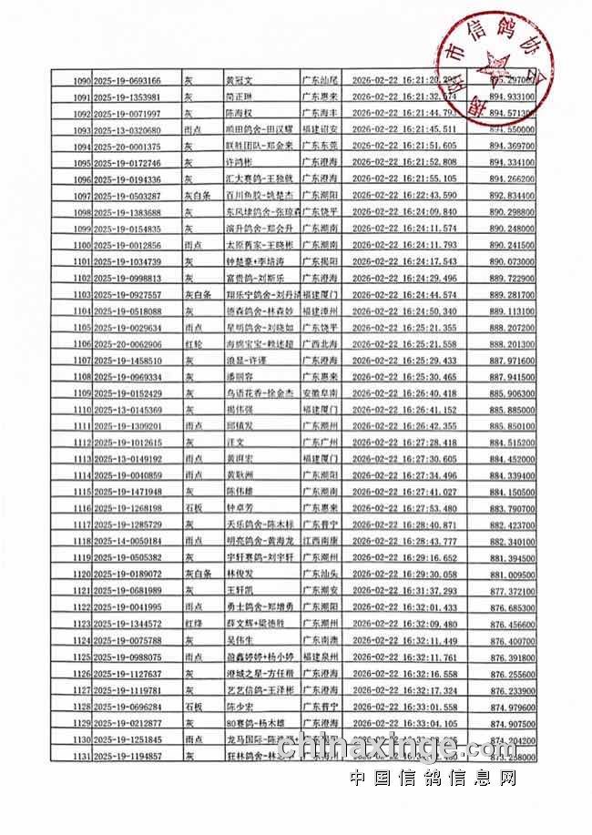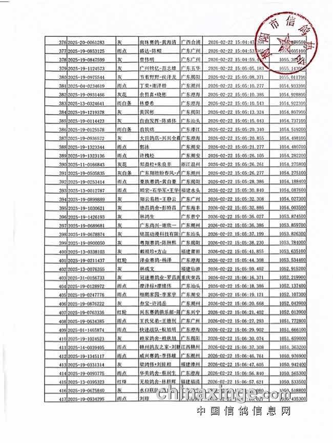 广东鸿栩(春棚)2026年首届春季四关赛附加赛前120名获奖鸽名单