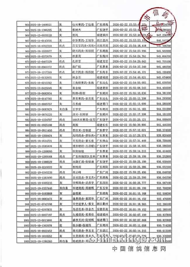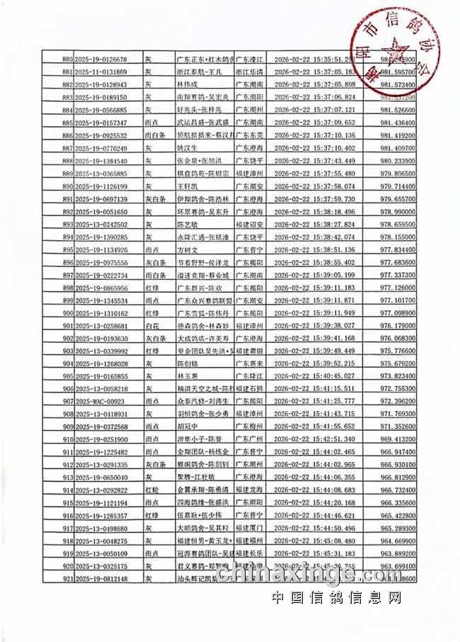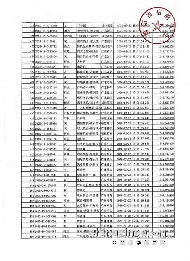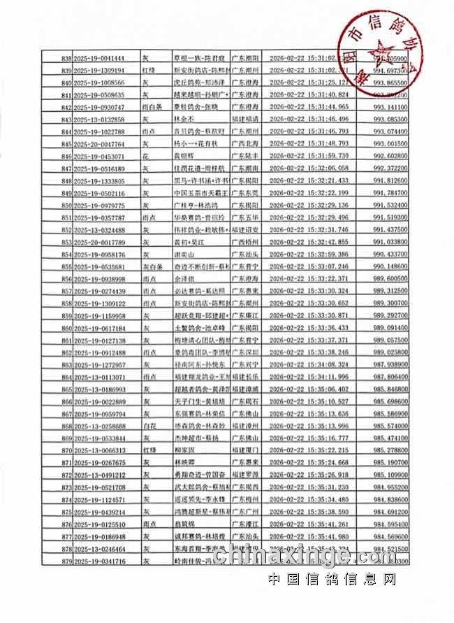 广东鸿栩赛鸽公棚2026年首届春季四关赛450-500公里第四关决赛比赛成绩单
