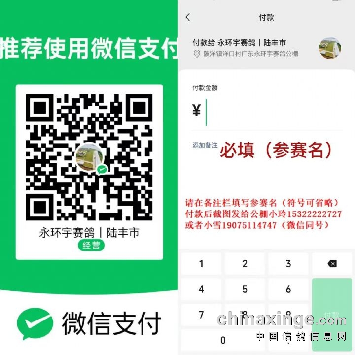 请扫描以下二维码,填写支付金额,并在“备注”里填写清楚鸽主参赛名,付款成功后截图发给