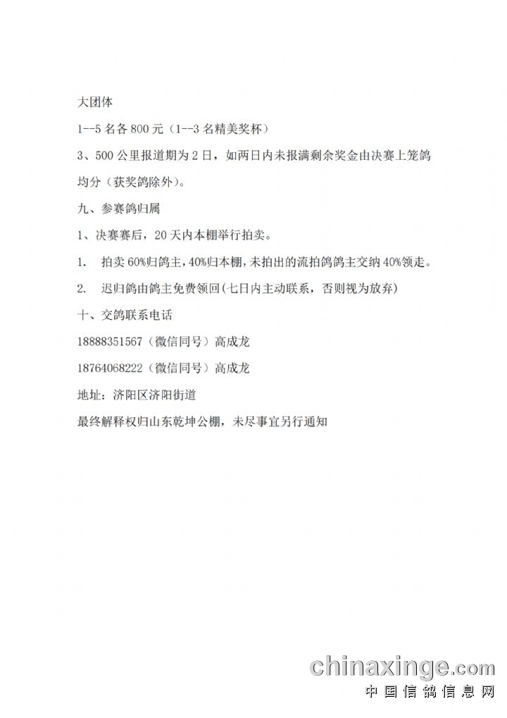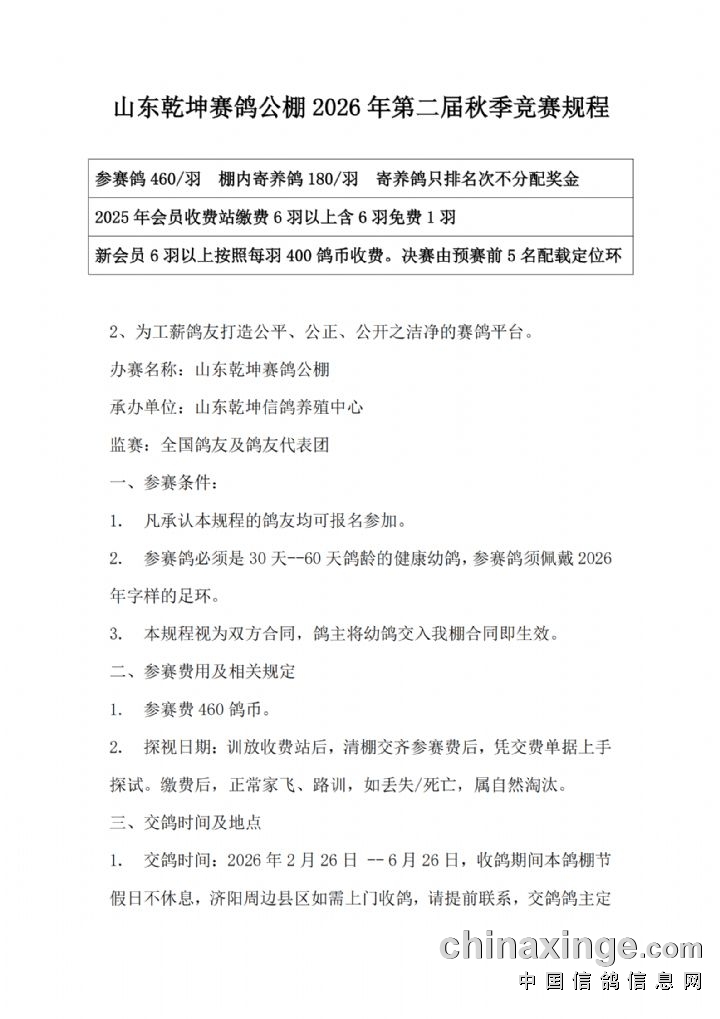山东乾坤赛鸽公棚2026年第二届秋季竞赛规程