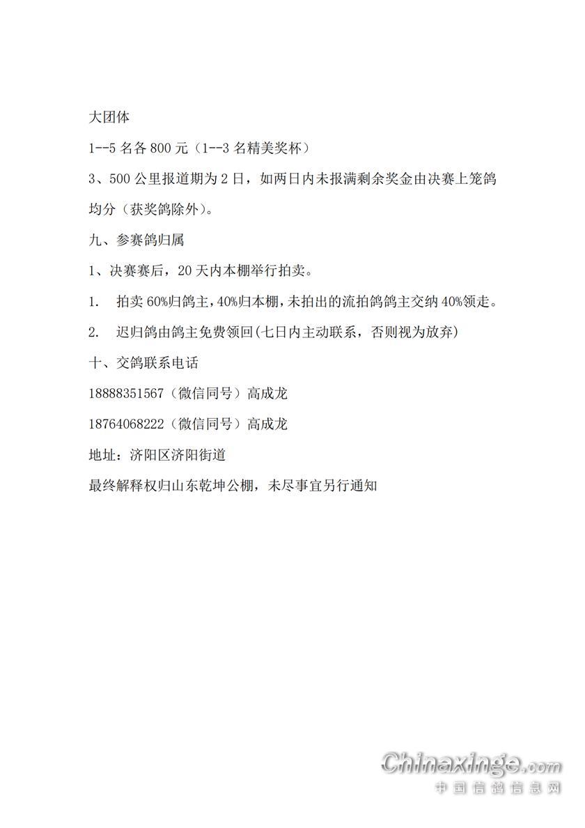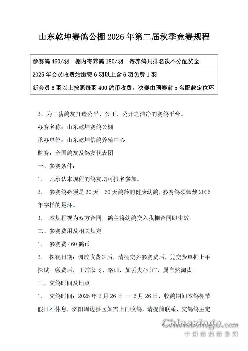 山东乾坤赛鸽公棚2026年第二届秋季竞赛规程