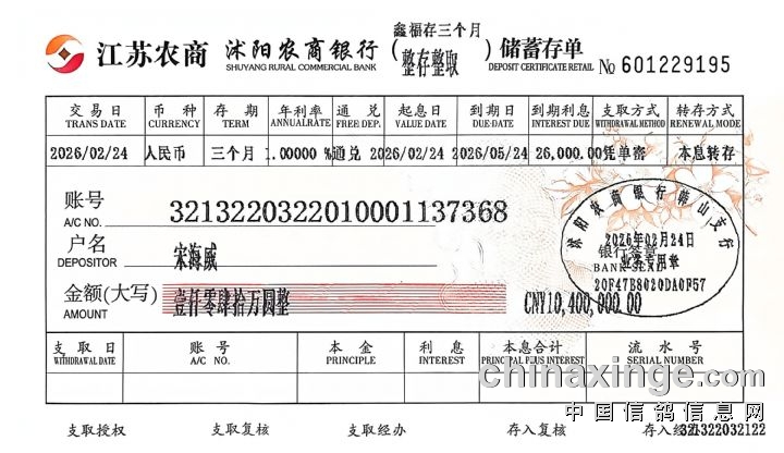 江苏宝宏春棚2026年总奖金全额存入账户证明