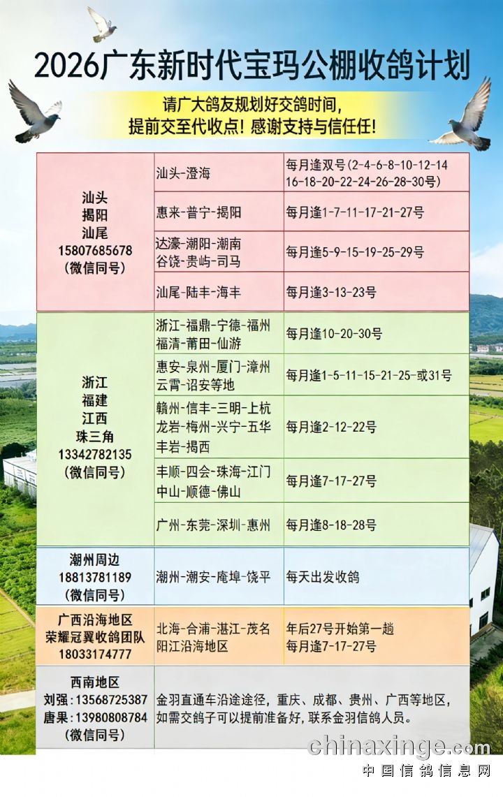 广东新时代宝玛(秋棚)2月底长途收鸽线路安排