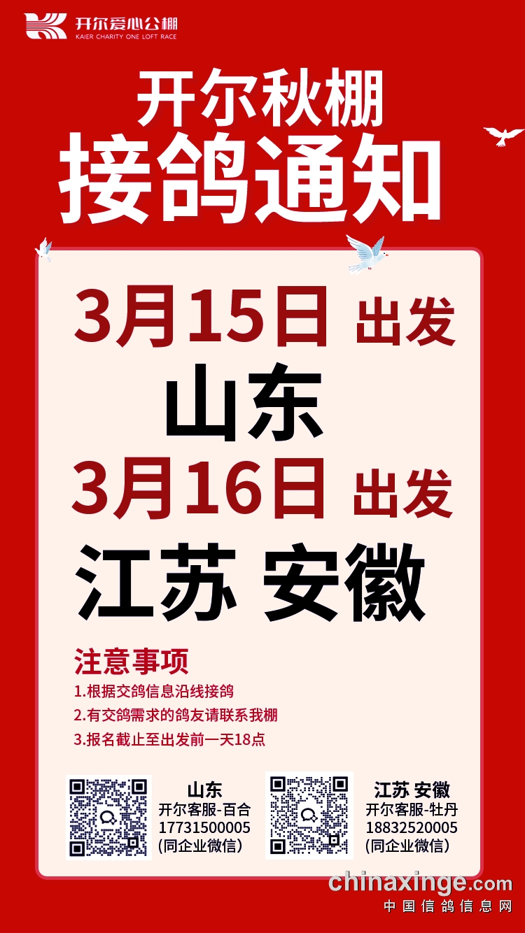 开尔爱心公棚(大棚)3月15日山东,3月16日江苏、安徽接鸽通知