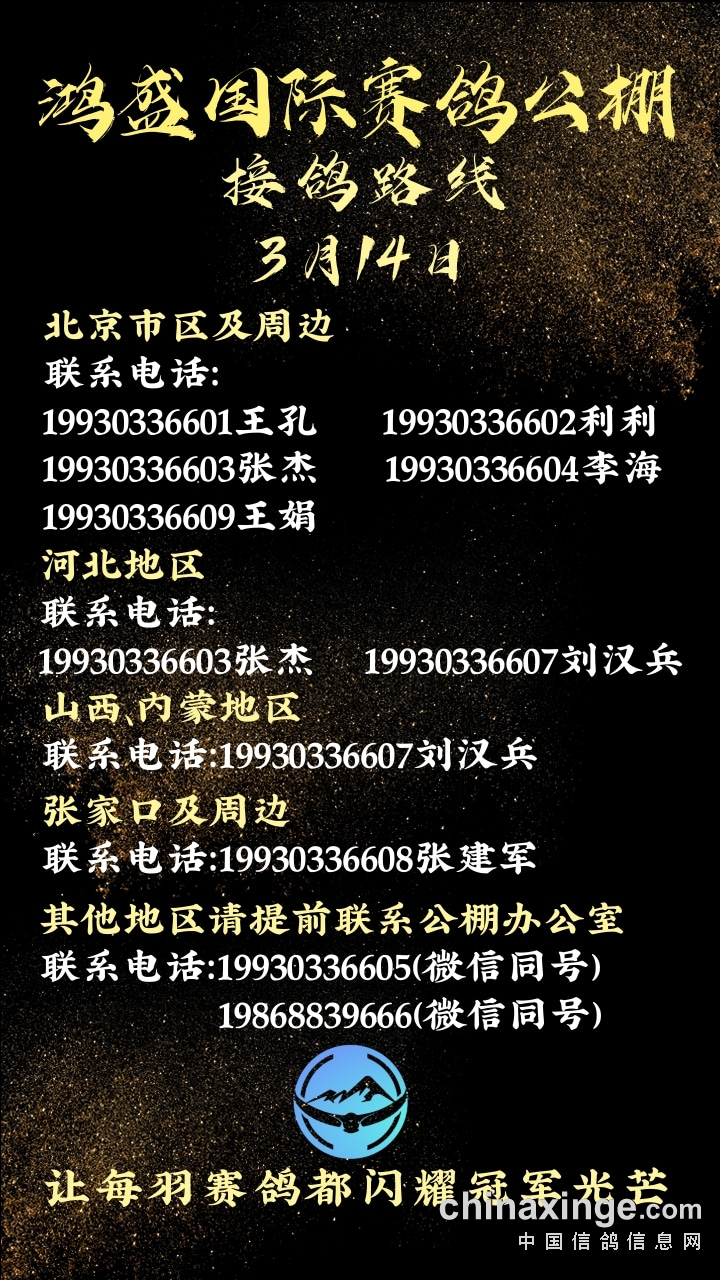鸿盛公棚3月14日接鸽路线
