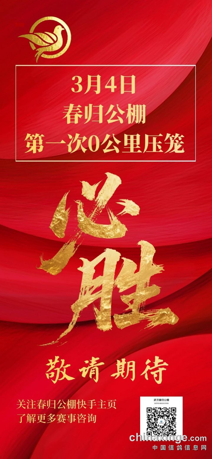 春归公棚(春棚)现根据爱鸽状态和天气情况,决定于2026年3月3日集鸽上笼,3月4日进行第一次路训(0公里)压笼。