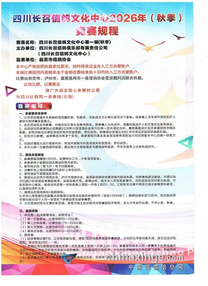四川长召信鸽文化中心2026年(秋季)竞赛规程
