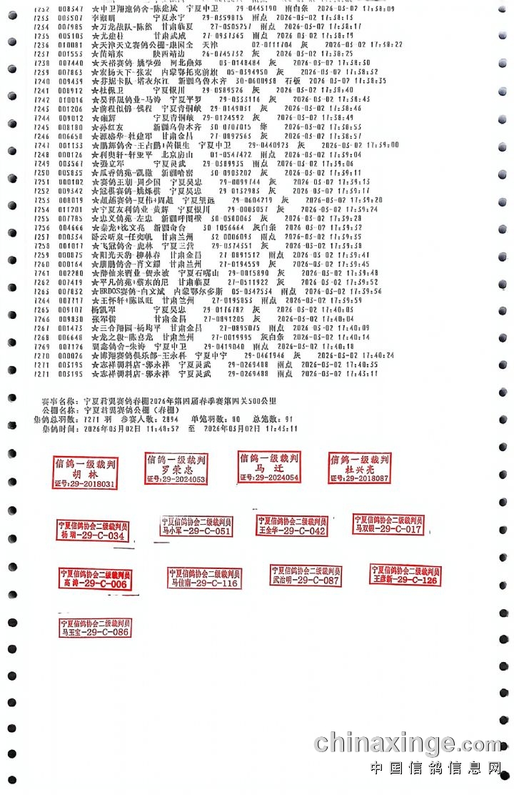 宁夏君翼赛鸽公棚(春棚)850公里集鸽明细--按时间