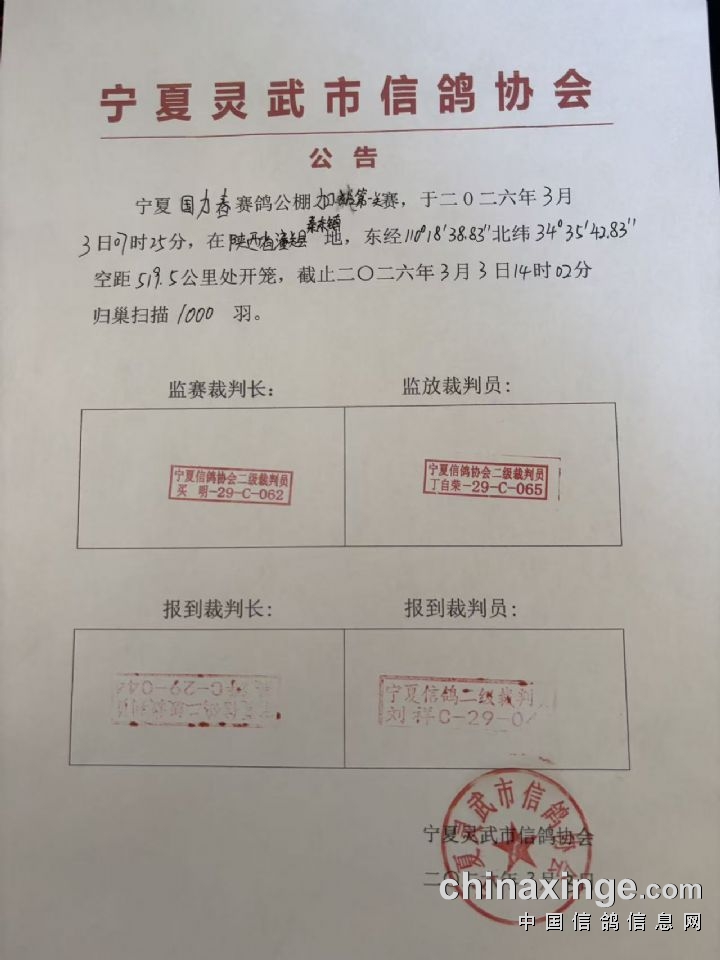 宁夏国力(春):双关鸽王加站赛第二关比赛通知