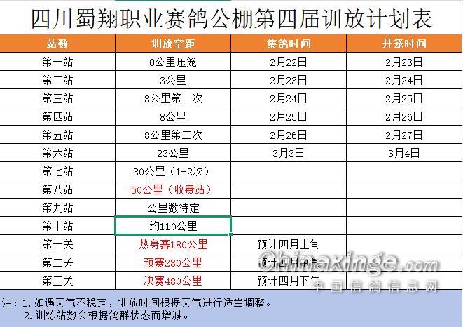 大家好,四川蜀翔职业赛鸽公棚第四届春赛训放计划如下: