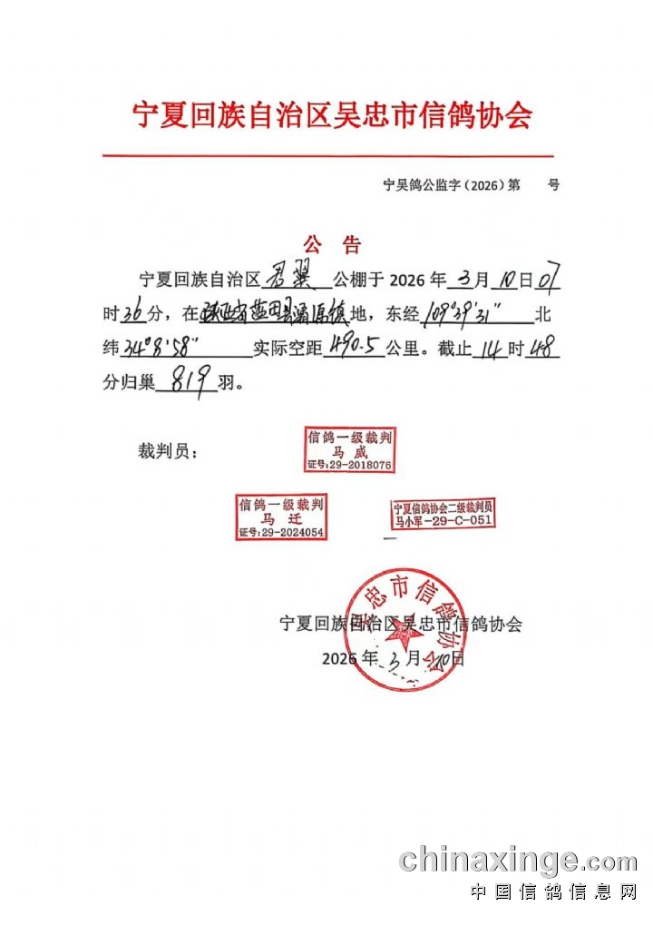 宁夏吴忠市信鸽协会公告
