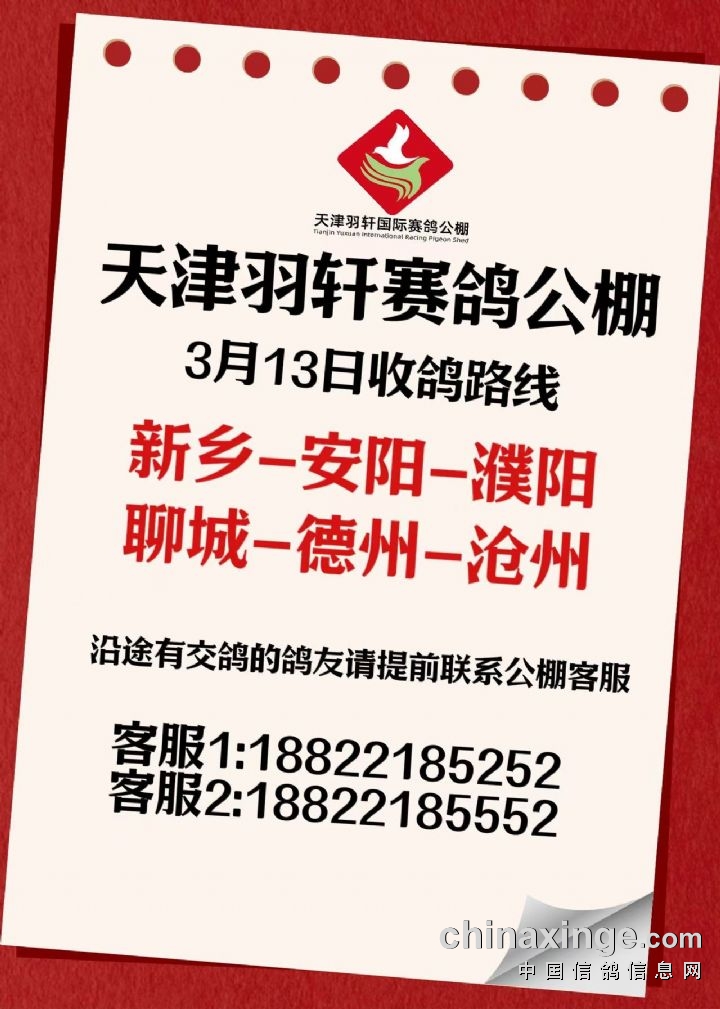 天津羽轩赛鸽公棚3月13日收鸽路线