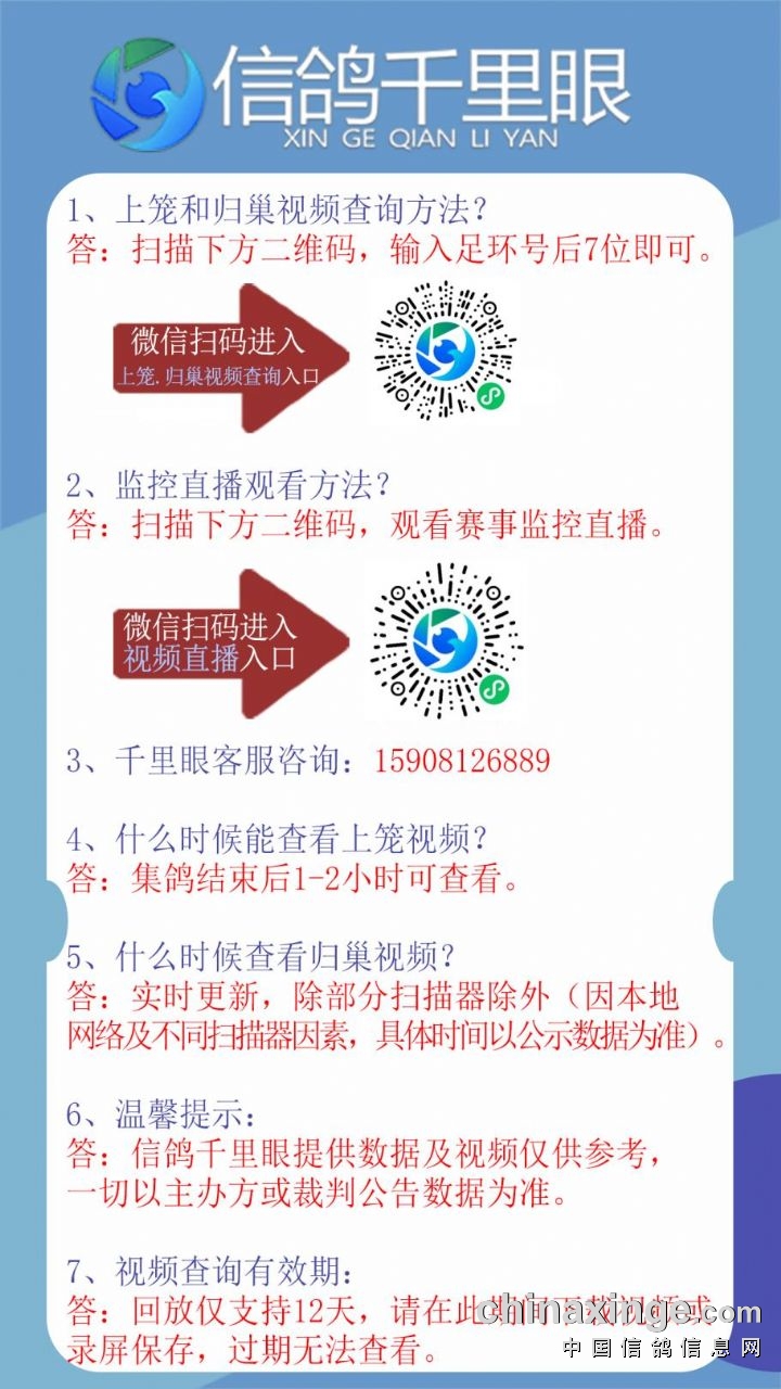 信鸽千里眼视频监控系统(简称信鸽千里眼),是一款服务信鸽赛事的可视化系统,致力于以信鸽赛事透明化服务为基础,让每一羽赛鸽得到应有的尊重,为信鸽赛事公开透明化赋能。信鸽千里眼硬件采用央企海康威视产品线标准生产,云平台基于央企萤石云开放平台开发,二者合一将音视频的直播、录制、存储、分析等能力在信鸽领域进行投入使用。