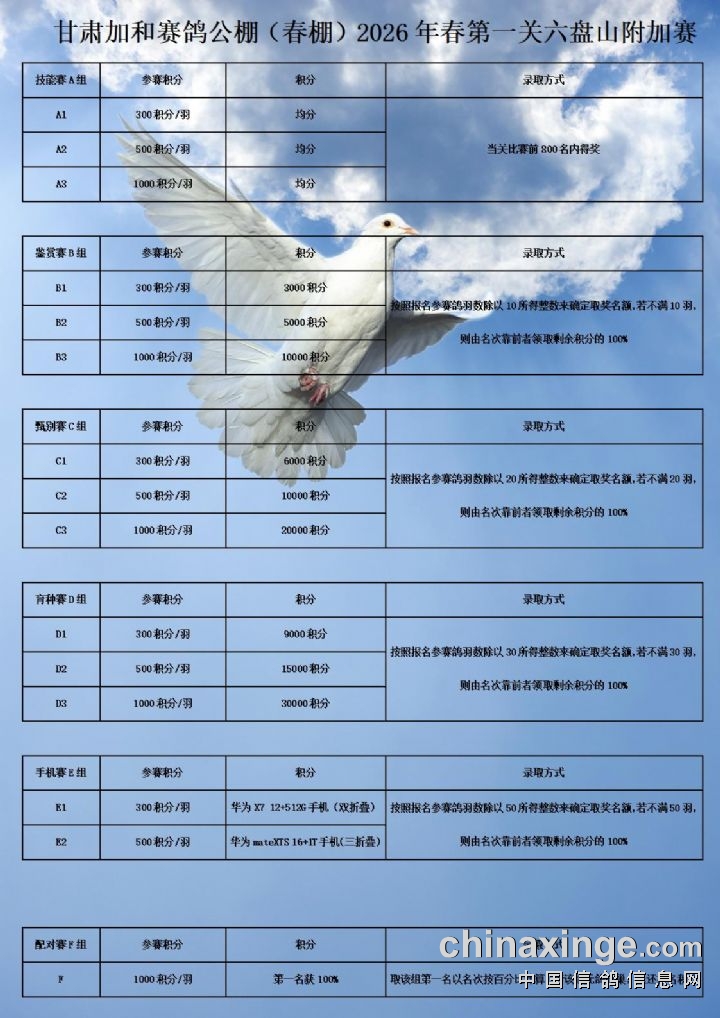 甘肃加和赛鸽公棚附加赛积分100%全额发放,第一关报名截止时间为集鸽完毕后5小时截止。