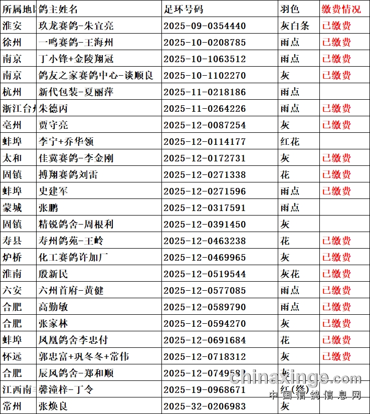 收费站的迟归鸽,200公里已归巢。会员可自愿选择缴费参赛,未缴费鸽子视为自动放弃后续比赛,现将缴费情况予以公示。