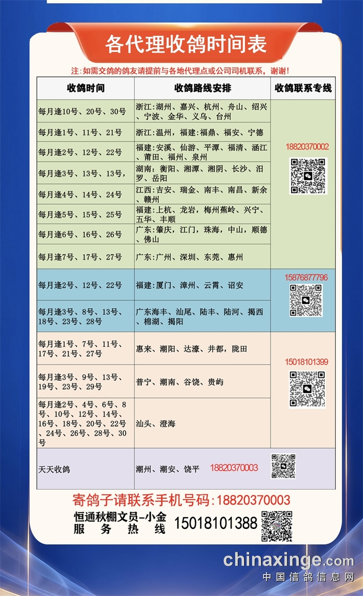 如需送鸽的鸽友请提前与本地代收点及司机联系,谢谢大家支持!