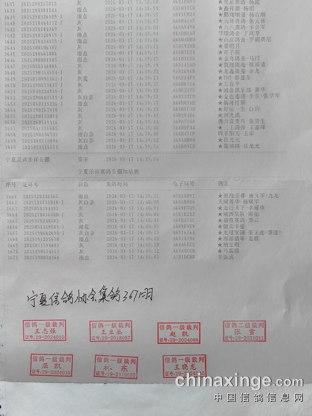 宁夏乐祥赛鸽公棚加站赛集鸽明细-按顺序
