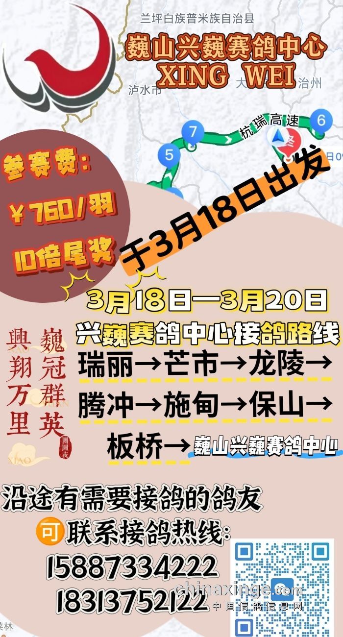 兴巍赛鸽:德宏-保山-公棚 接鸽通知