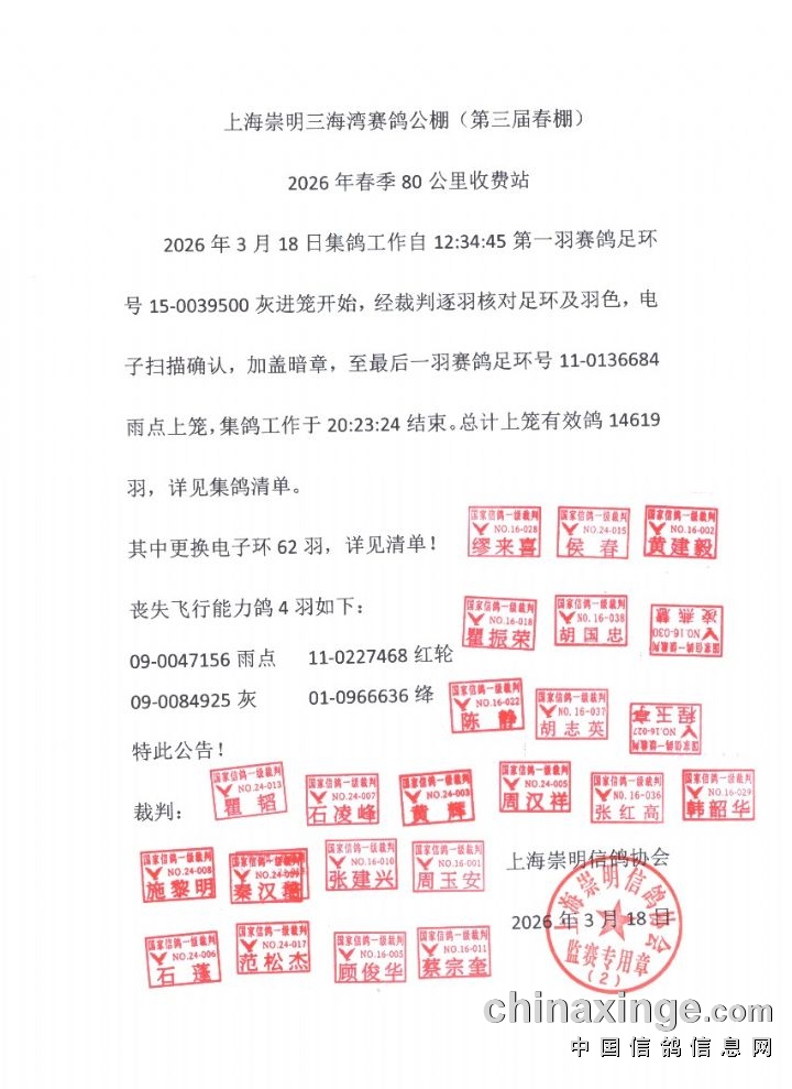 上海三海湾2026年第三届春棚80公里收费站集鸽清单